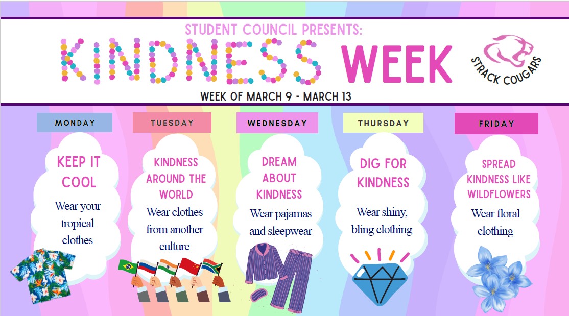 This week, Student Council is leading our campus in celebrating Kindness Week! It’s a great opportunity for our Cougar community to focus on the small actions that make a big difference—encouraging words, helping others, and spreading positivity throughout our school. Students are invited to participate in fun themed dress-up days as we celebrate kindness across campus. |