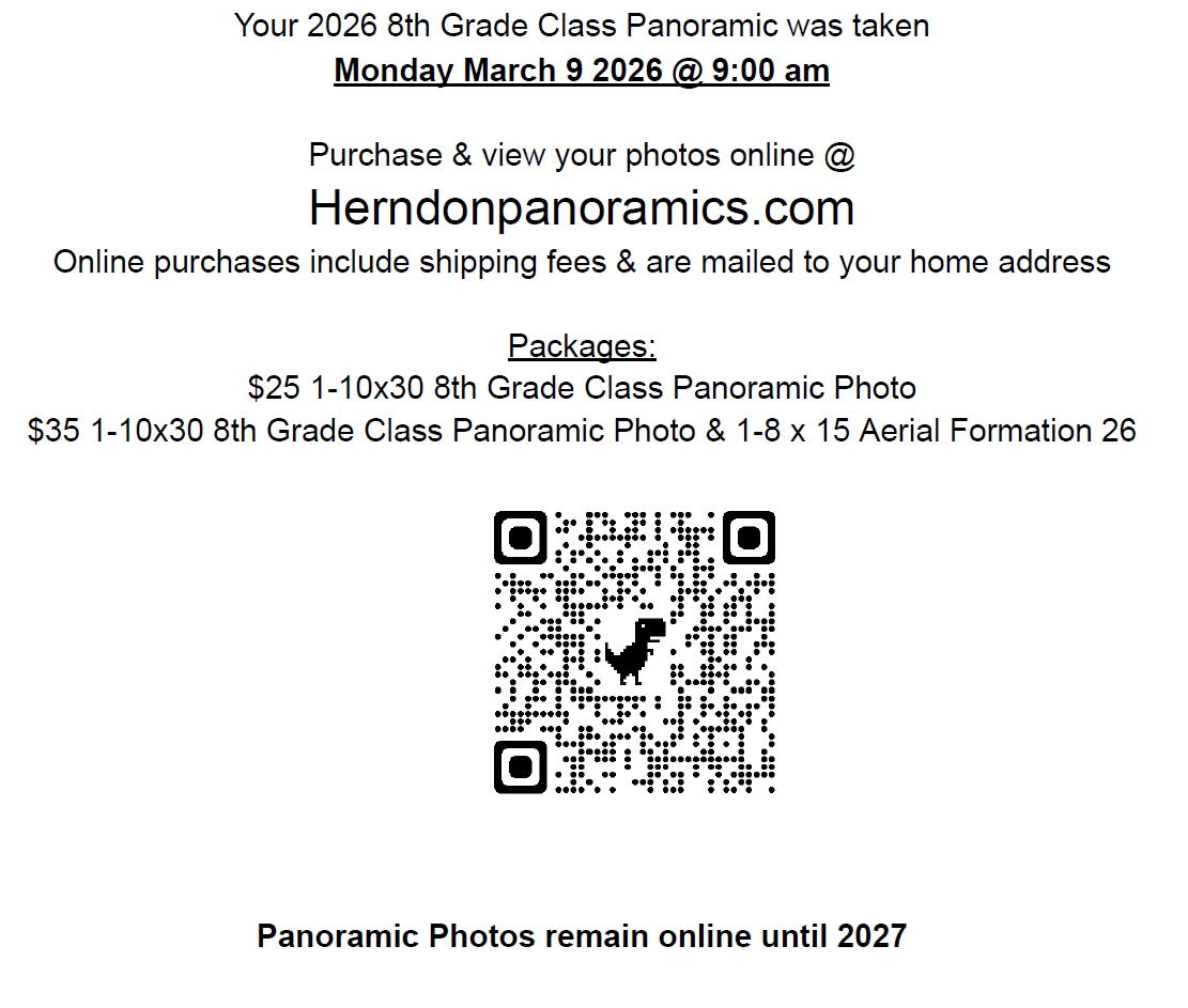 8th grade students took their panoramic picture on Monday, March 9th. Families may purchase directly through Herndon Panoramics . Please see the purchasing information below. |